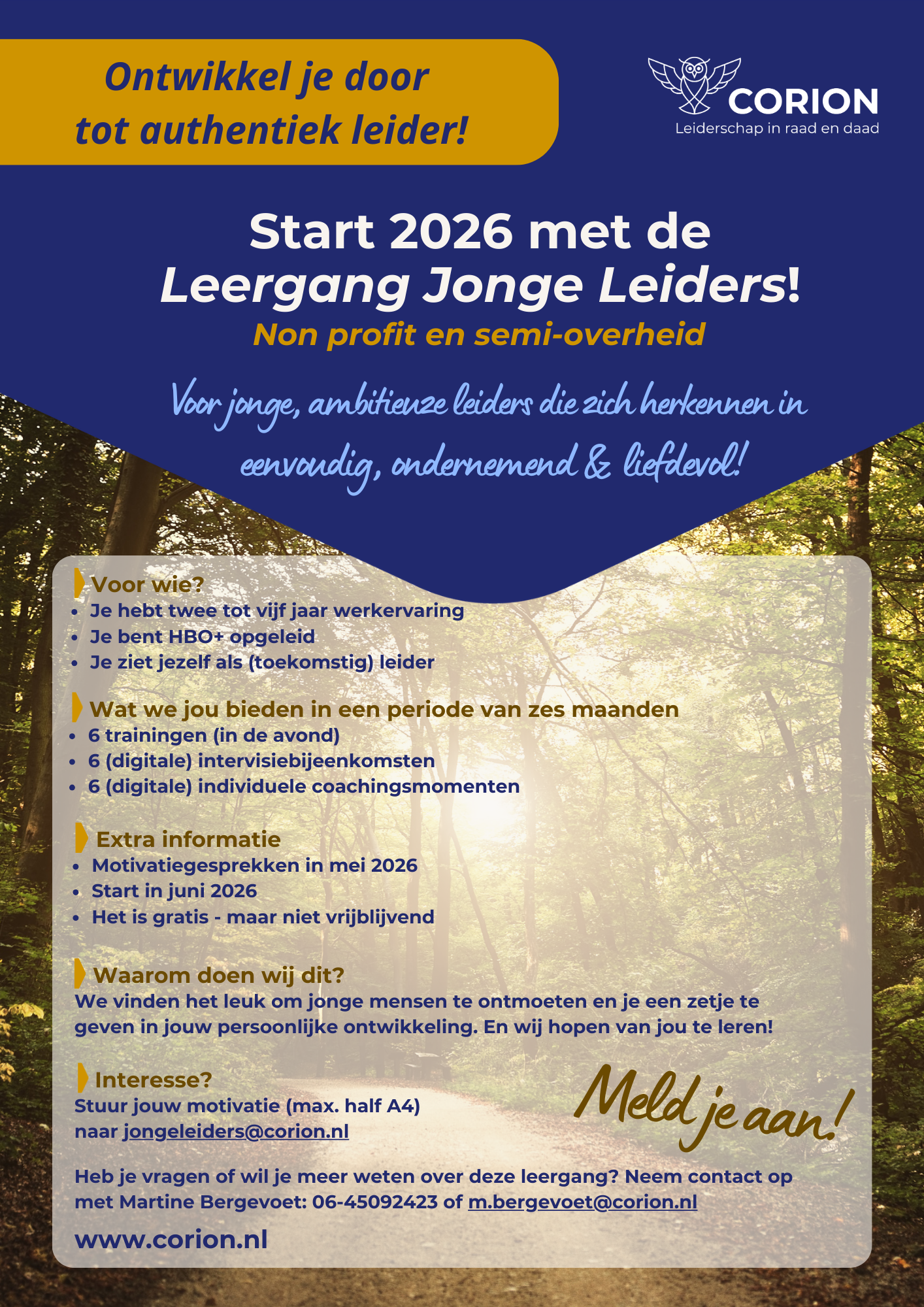 Ben je tussen de twee en vijf jaar aan het werk, HBO+ opgeleid en klaar voor een volgende stap? Stuur dan jouw motivatie (max. een half A4) naar jongeleiders@corion.nl